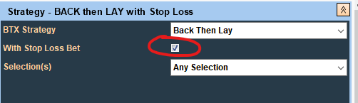 Set For Loss % - You specify a required loss percentage value that will be obtained if both bets 1 and the stop-loss are matched. For this feature there is an internal BTX function that will automatically calculate the values for the Stop-Loss bet on-the-fly in order to achieve a specific loss amount whichever selection wins. When you have specified a loss percentage value for the Stop-Loss, and the Stop-Loss bet is triggered (see below), the BTX with calculate the stake and price for the Stop-Loss in order to achieve the required loss.