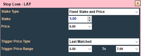 In the case of Bet1 being a Lay bet, the Stop-Loss Back bet price will be the specified number of ticks lower than the matched Bet1 price. The stake will be automatically calculated so that if the bet is matched it will result in an equal loss no matter which selection wins.