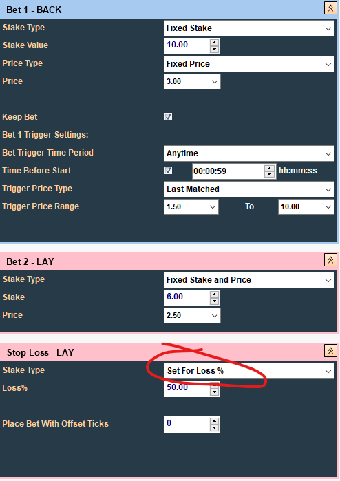 For example, if the Bet 1 stake is £10 and you want to limit the possible loss to £5 then you would specify a loss of 50%. See also the section Stop Loss Bet Placement With Offset Ticks.