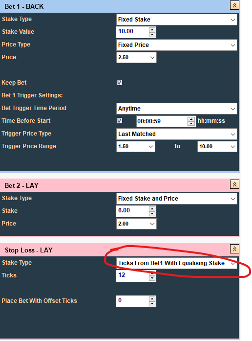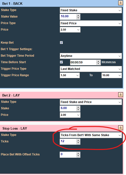 If Bet1 is matched with £10 at 2.50 then if the market moves against us and the LPM is 12 ticks or more higher at 2.74, then the Stop-Loss bet will be placed with £10 at 2.74 (resulting in -£2.40 if the selection wins and break-even on all other selections). See also the section Stop Loss Bet Placement With Offset Ticks.