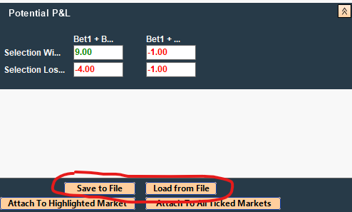 All of the values and settings on a Bet Plan can be saved to disk for future retrieval. Click the “Save to File” button to activate the save function. This will prompt you to enter a filename which by default will have the extension “.bp”