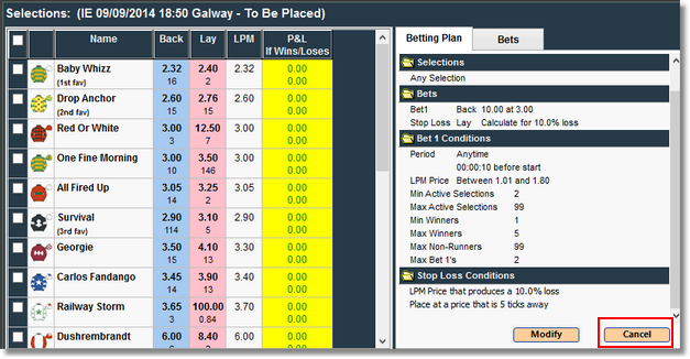 Having attached bet plan(s) to market(s) you may cancel them if required using one of the following methods: