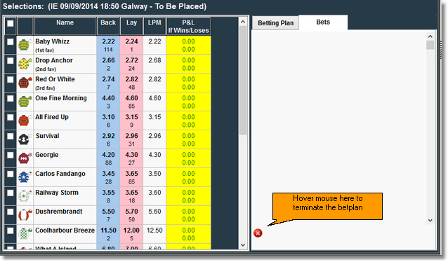 At the bottom left of the Bets tab there is a red button icon. If you hover the mouse cursor over this then the “Terminate Betting Plan” button will be revealed.