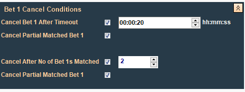 Cancel After Timeout – If this option is selected then the use can specify a timeout period. If Bet1 has not been matched when this period expires then it will be canceled. The timeout periods starts from the time at which the BTX sends the Bet1 placement instruction to Betfair. If Bet1 has been partially matched when the timeout expires then it will only be canceled if you have also selected the ‘Cancel Partial Match’ option.