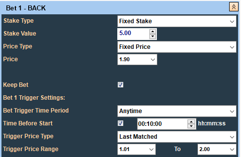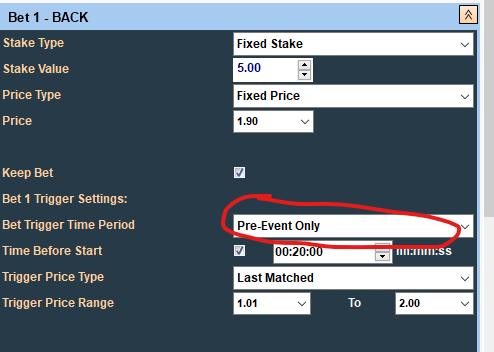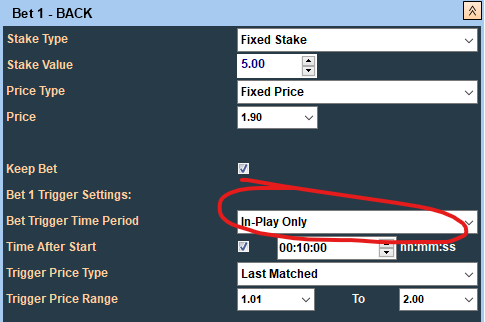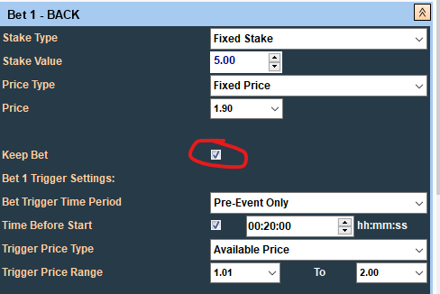 Anytime - Bet1’s that are triggered pre-event and are unmatched when the market is turned in-play, will be canceled unless Bet 1 Keep Bet is selected.