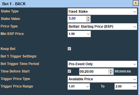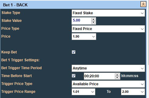 •Fixed Price– Enter a specific price value from the drop-down list of valid Betfair prices.