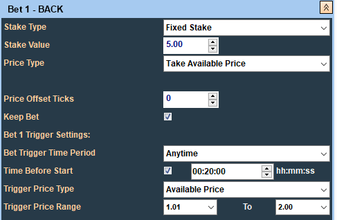 •Take Available Price– This options instructs the BTX to place the bet at whatever price is currently available (Back or Lay as appropriate) at the time when the Bet 1 trigger conditions are satisfied. Note that you can limit the range of acceptable prices on the Bet 1 trigger conditions section. With BTX Ultimate there is an additional option to place Bet1 at the available price plus a specified number of offset price ticks. The offset ticks can be in the direction of either a better or worse price (i.e. for a Back bet a better price would be higher but for a Lay bet it would be lower).