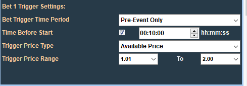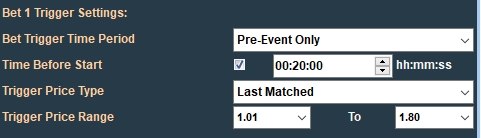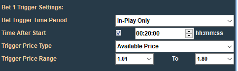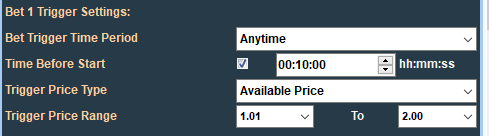 Bet 1 will only be placed when the specified trigger conditions have been satisfied. These are set on the "Bet 1 Trigger Conditions" panel and consist of: