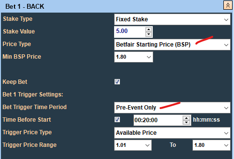 Note: if you have selected Betfair Starting Price (BSP) for the Bet1 price type then the BTX will force the Period setting to Pre-Event.