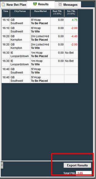 selection (depending on the bet plan), the P&L result and the bet plan settings used.