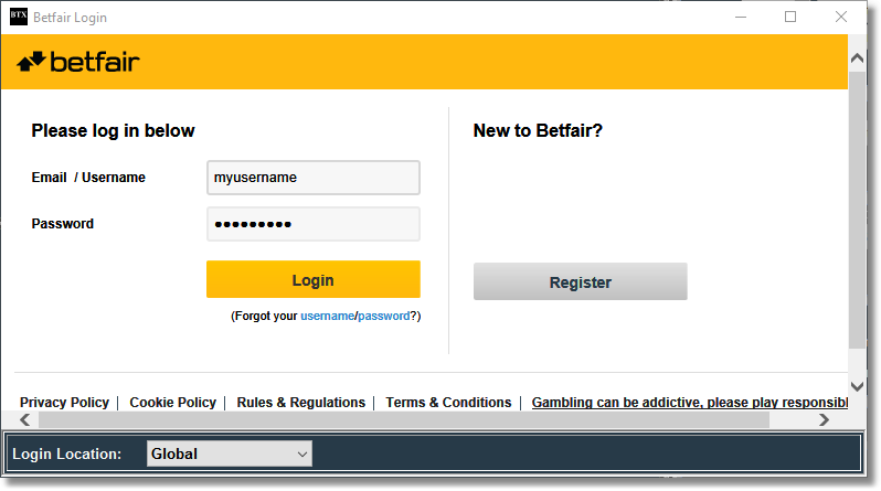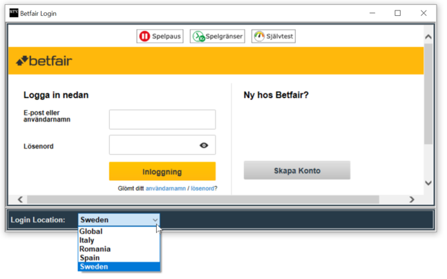 If you are logging in from Sweden, Romania, Italy or Spain just select the correct Betfair option on the Login location as shown below.